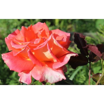 Бутоны этой розы имеют волнистые края огненно-оранжевого оттенка и золотисто-желтую серединку. По мере распускания их цвет меняется на лососевый с розоватым отливом. Полностью раскрывшийся цветок достигает крупных размеров — 10-12 см в диаметре, имеет полумахровую форму чаши и приятный аромат, который ощущается даже на значительном расстоянии.